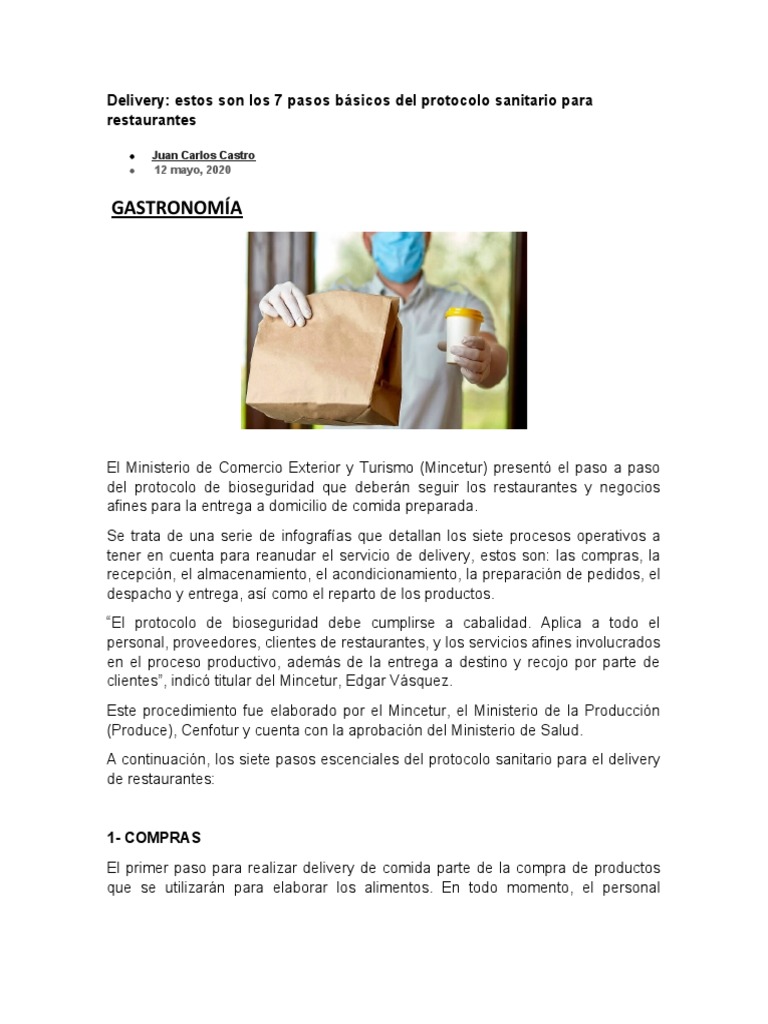 A partir de la próxima semana unos 2,000 los restaurantes podrán volver a funcionar a través de delivery o entrega en tienda. Elvis florentini 08/05/2020 comer & beber, hoy. La norma publicada hoy establece medidas sanitarias que deben cumplir los establecimientos, con el fin de proteger la salud del personal. Produce aprueba protocolo para reinicio del servicio de entrega a domicilio por terceros (delivery) para restaurantes y comercio electrónico de bienes para el hogar nota de prensa. El protocolo presentado por la asociación peruana de hoteles, restaurantes y afines (ahora perú), entró en vigencia durante la segunda semana de mayo.